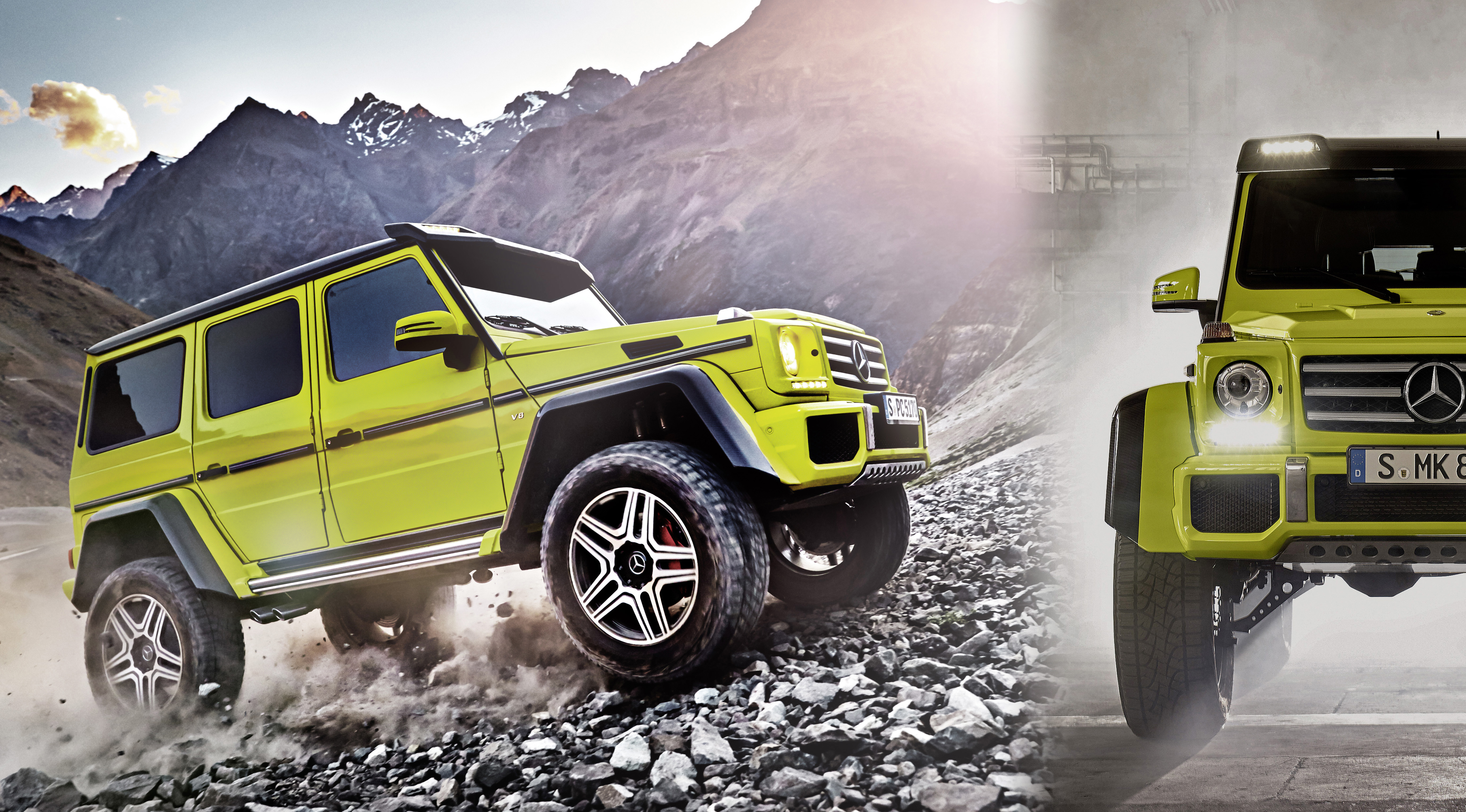 В отличие от пикапа AMG 6x6, G500 4x4² оснащается "всего лишь" стандартным 416-сильным турбомотором серийной версии (V8 4.0 литра). Однако благодаря тому, что 4-колесный внедорожник более чем на тонну легче 6-колесного пикапа (2,7 тонны против 3,8), динамика даже улучшилась: