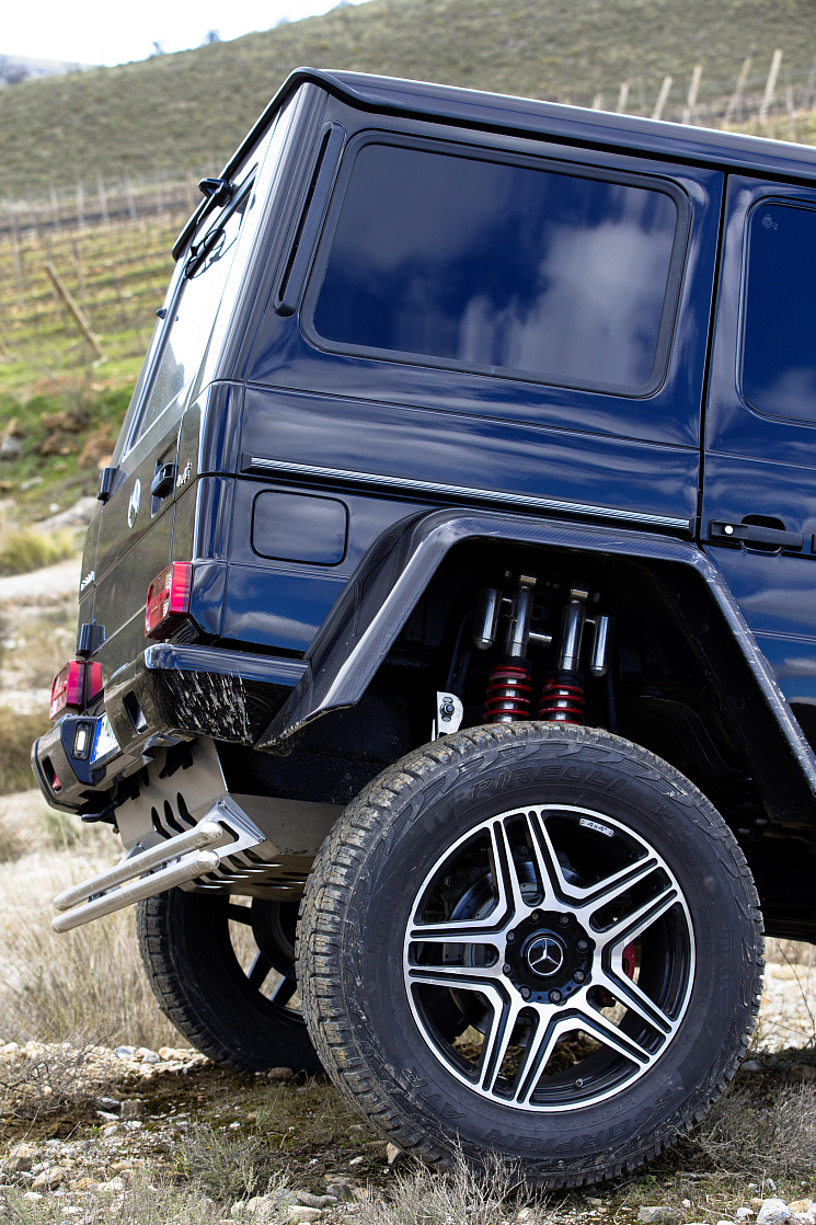 Портальные мосты версии 4x4² увеличили не только дорожный просвет, но и ширину "Гелендвагена" аж до 210 см (а колею - до почти 180 см). Помимо градиозного внешнего вида, это радикально повышает устойчивость при преодолении косогоров на бездорожье, а также в быстрых поворотах.