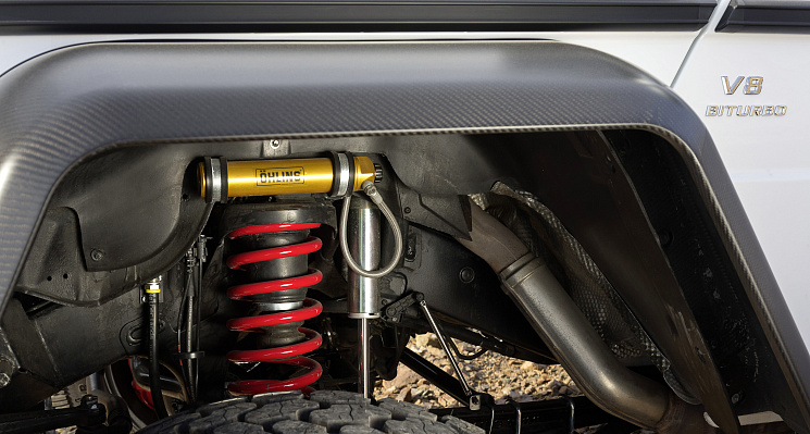 Подвеска G500 4x4² абсолютно новая в сравнении с обычным G-классом. Помимо портальных мостов, подвеска отличается сдвоенными пружинами и амортизаторами на каждом колесе. При этом один из двух амортизаторов на каждом колесе - с классический, с постоянными характеристиками. А второй - электронно-настраиваемый, жесткость которого можно менять кнопками из кабины.