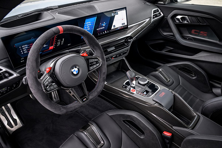 Интерьер BMW M2 CS также обильно украшен углепластиком. Такие вставки есть на передней панели и центральном тоннеле, из этого материала сделаны кресла с интегрированными подголовниками и возможностью установки многоточечных ремней безопасности. «Ковши» обшиты кожей Merino и снабжены логотипом CS с подсветкой. Аналогичными эмблемами усыпан весь салон. Скошенный руль обшит алькантарой и имеет метку нулевого положения. На центральной консоли выделена кнопка доступа к выбору ездовых режимов и гоночной телеметрии.